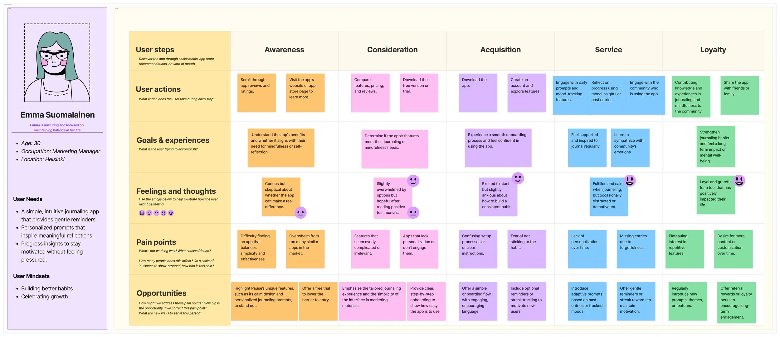 As the personas were defined, I moved on to create a user journey map to better understand and empathize with the users of Pause.